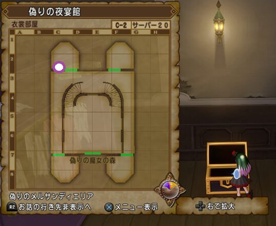 | 偽りの夜宴館 | C-2黒宝箱![]() 夜宴館に入るにはクエストNo370~372をクリアする必要がある。 うつくしそうのある部屋に入るには、しぐさ『解放の祈り』が必要。 |