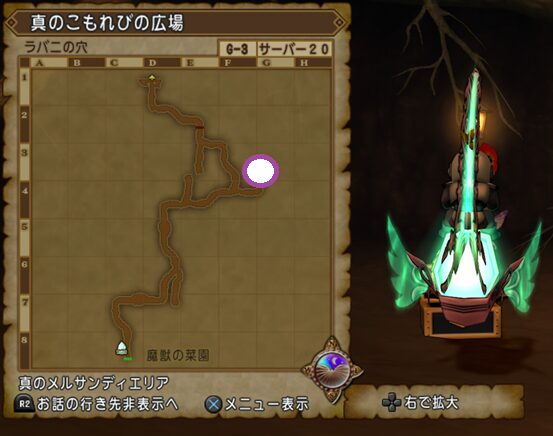 | 真のこもれびの広場 | ラバニの穴F-3黒宝箱![]() C-8とD-8の間からラバニの穴に行って、大盗賊のカギで開けられる扉の先 |