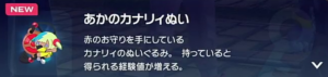赤のお守りを手にしているカナリィのぬいぐるみ。